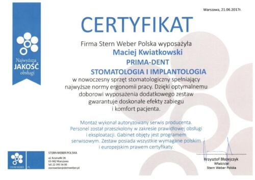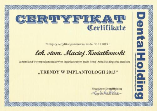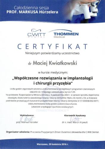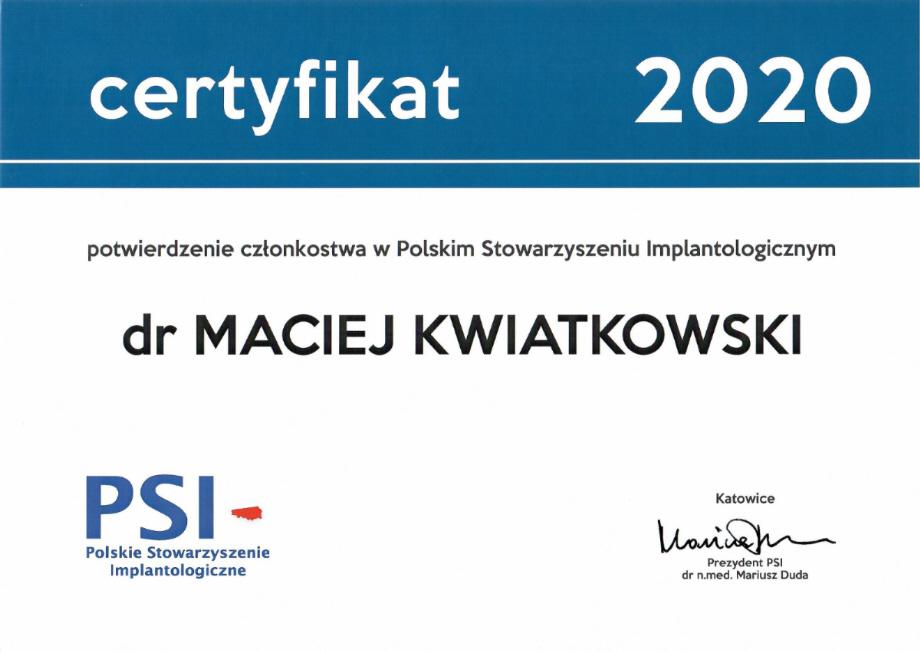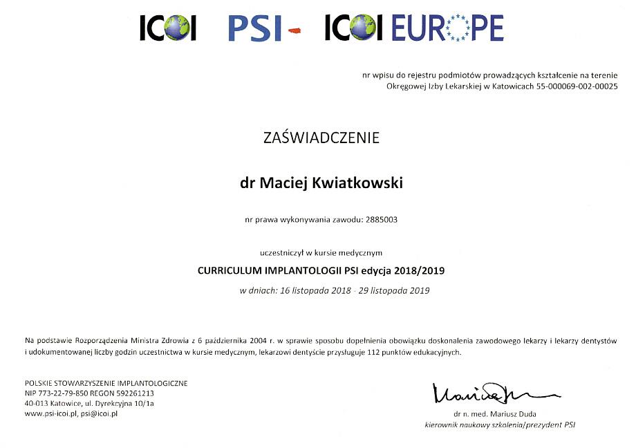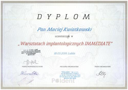 W 2018 r. ukończył 2 letnie Curriculum implantologiczne i uzyskał tytuł implantologa nadawanego przez Polskie Stowarzyszenie Imaplantologiczne. Zajmuje się kompleksowymi planami leczenia, chirurgią stomatologiczną, periodontologią, implantologią, implantoprotetyką oraz protetyką stomatologiczną.